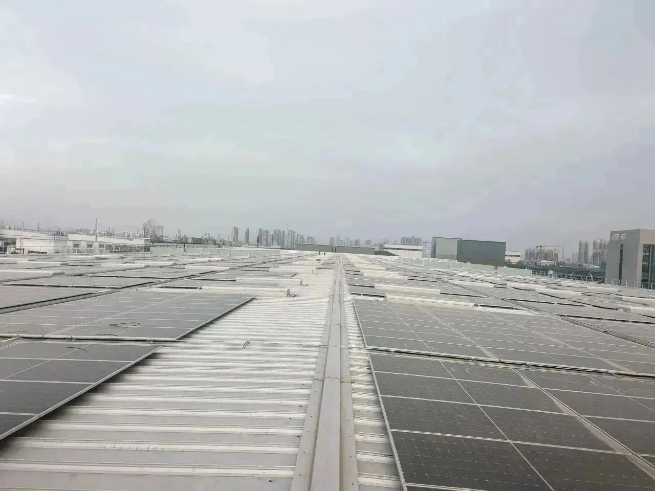 西安德秦项目位于陕西省西安市经济技术开发区德邦物流院内厂房屋顶,项目总投资2302.76万元。项目拟占用屋顶面积约4.2万平方米,总装机容量4.25MW,共铺设8620块580Wp组件,直流侧容量5MWp,利用园区原有变配电设施,采用380V低压接入电网,项目并网后每年可发绿电490万千瓦时,节约标准煤约 1979吨,减排二氧化碳近4885吨,具有良好的生态效益和社会效益。