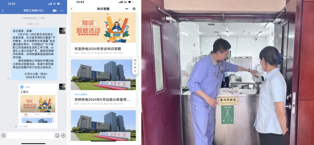 “节约粮食、反对浪费和分类减量”成为京西热电倡导的新时尚。在垃圾分类宣传周活动中,开展了视频讲解、板牌宣传、员工座谈、知识问答(262人次)、公众号宣传等活动,大大提高了员工对生活垃圾分类工作重要性的认识。从源头上减少垃圾产生,从“我”做起、从“小”做起,养成绿色生活和工作习惯,提高资源循环利用率,共同构建美丽宜居的城市环境。